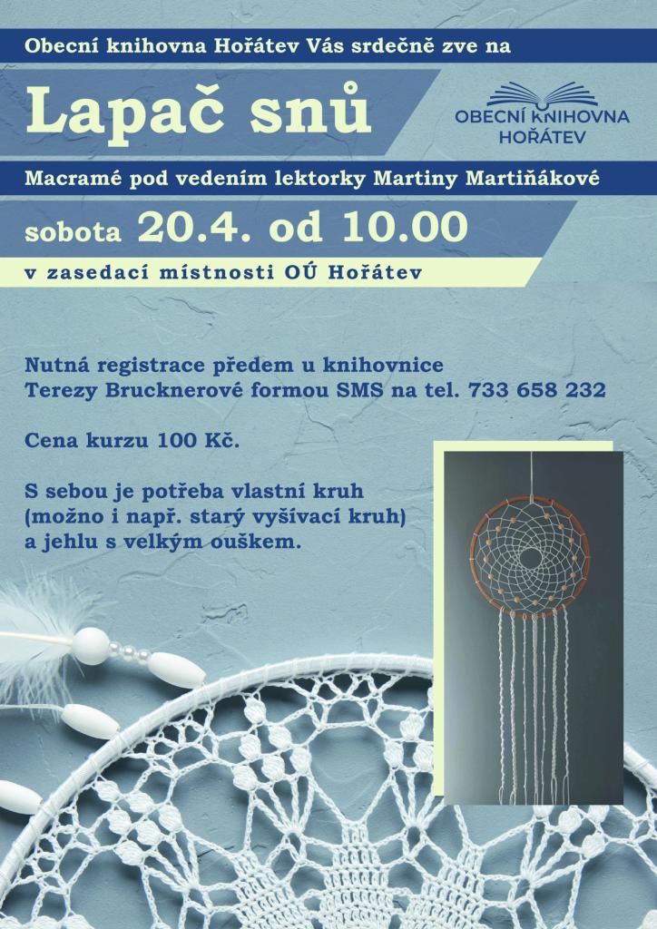 Obecní knihovna Hořátev ve spolupráci s paní lektorkou Martinou Martiňákovou Vás srdečně zvou na další kurz macramé, tentokrát ve znamení lapačů snů pomocí kroužkovacího uzlu.