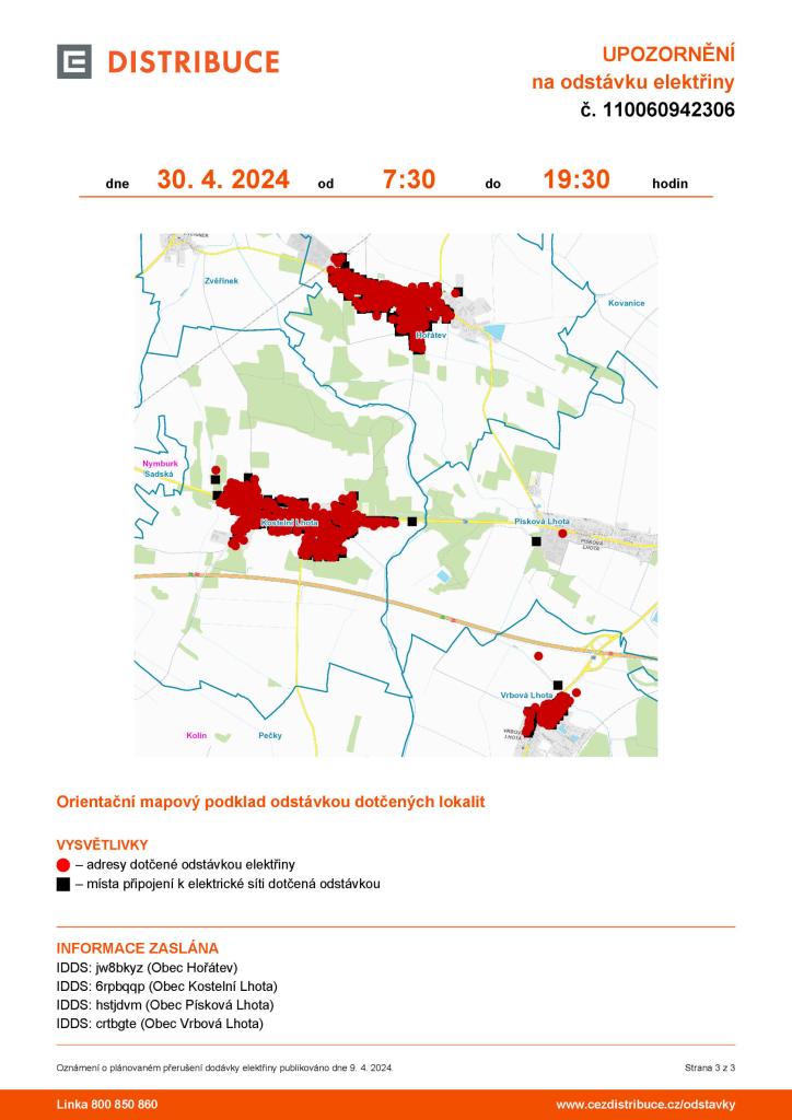 UPOZORNĚNÍ na odstávku elektřiny v úterý 30.4.2024 v čase 7.30 - 19.30.