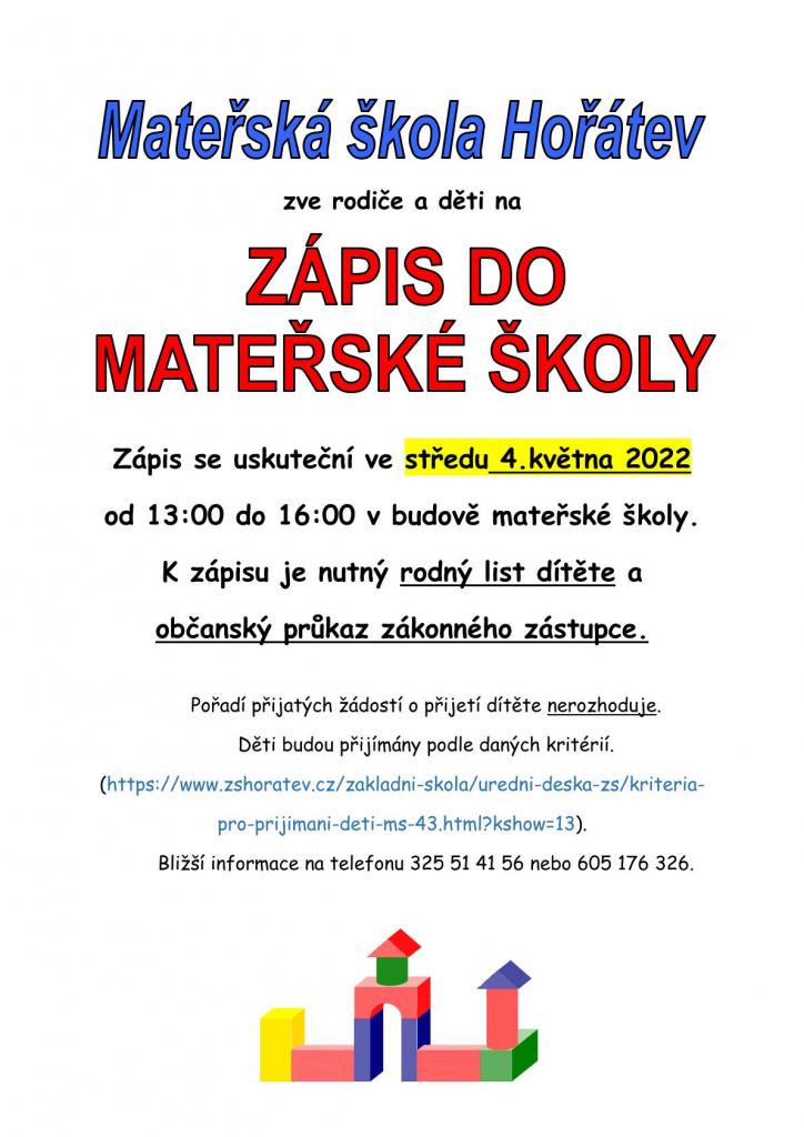 Zápis se uskuteční ve středu 4. května 2022 od 13:00 do 16:00 v budově mateřské školy.