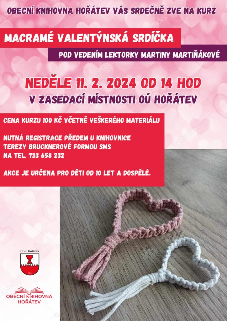 Akce se bude konat v neděli 11.2.2024 od 14:00 v zasedací místnosti OÚ Hořátev. Cena tvoření je 100 kč. Rezervace nutná na tel. 733 658 232.