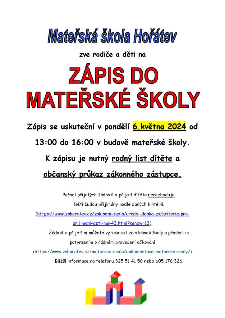 Zápis se uskuteční v pondělí 6.května 2024 od 13:00 do 16:00 v budově mateřské školy. K zápisu je nutný rodný list dítěte a občanský průkaz zákonného zástupce.